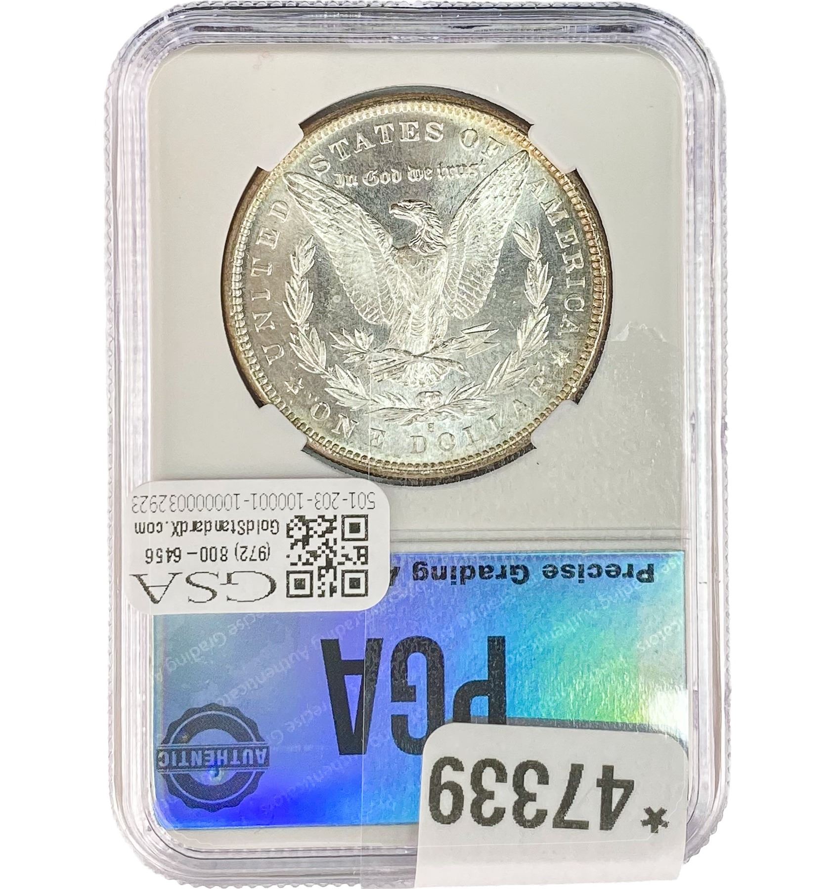 COINS AND CURRENCY LISTED IN GSA’S CATALOG AS GRADED AND ENCAPSULATED BY PCGS, NGC, ANACS, ICG, PCGS CURRENCY, PMG, PCGS BANKNOTE GRADING, CMC OR ANY OTHER THIRD-PARTY GRADING SERVICE ARE LIKEWISE SOLD “AS-IS” EXCEPT AS EXPRESSLY SET FORTH HEREIN. ALL THIRD-PARTY GRADING SERVICE GUARANTEES, INCLUDING AUTHENTICITY, ARE THE SOLE RESPONSIBILITY OF THE THIRD-PARTY GRADING SERVICE AND NOT WARRANTIES OR GUARANTEES OF GSA. BIDDERS SHOULD CONTACT THESE THIRD-PARTY GRADING SERVICES DIRECTLY WITH RESPECT TO ANY CLAIMS OR QUESTIONS THEY MAY HAVE CONCERNING THEIR GUARANTEES AND WARRANTIES. BIDDERS ACKNOWLEDGE AND AGREE THAT AUCTIONEER IS NOT BOUND BY OR LIABLE FOR ANY OPINION OR CERTIFICATION BY ANY THIRD-PARTY GRADING SERVICE. REMOVAL OF A PRODUCT FROM ITS PROTECTIVE CASING OR HOLDER OR ALTERATION OF ANY COIN HOLDER WAIVES ALL RIGHTS CONCERNING THE PRODUCT CONTAINED THEREIN.