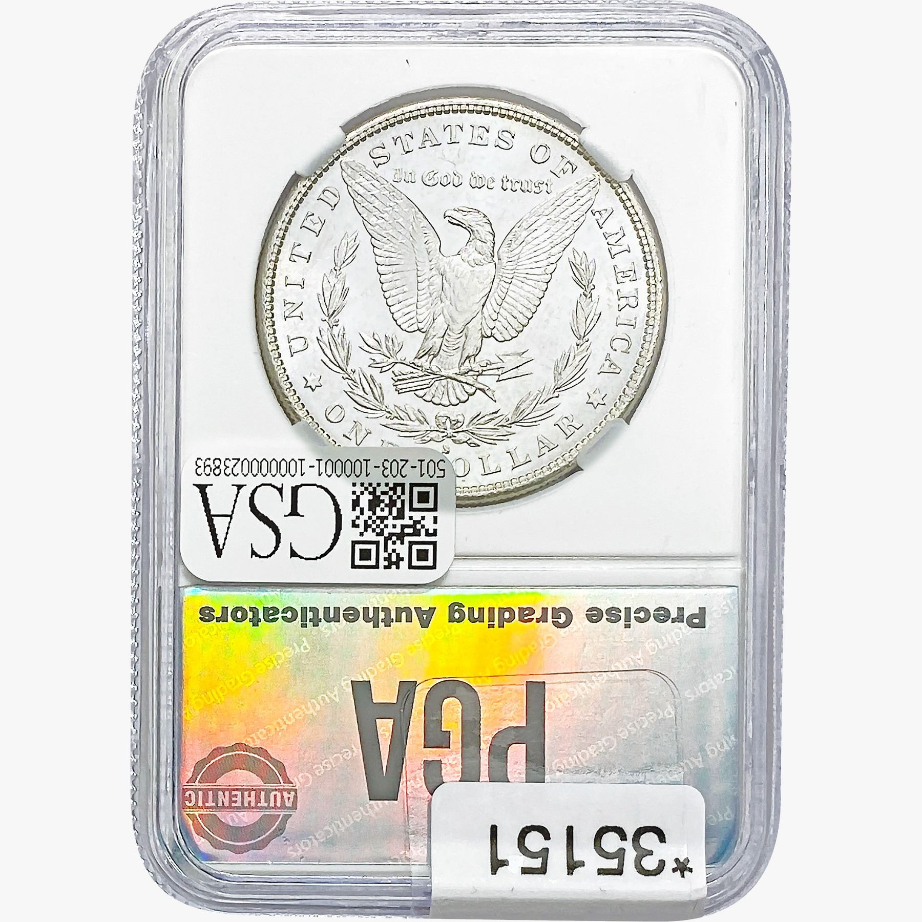 COINS AND CURRENCY LISTED IN GSA’S CATALOG AS GRADED AND ENCAPSULATED BY PCGS, NGC, ANACS, ICG, PCGS CURRENCY, PMG, PCGS BANKNOTE GRADING, CMC OR ANY OTHER THIRD-PARTY GRADING SERVICE ARE LIKEWISE SOLD “AS-IS” EXCEPT AS EXPRESSLY SET FORTH HEREIN. ALL THIRD-PARTY GRADING SERVICE GUARANTEES, INCLUDING AUTHENTICITY, ARE THE SOLE RESPONSIBILITY OF THE THIRD-PARTY GRADING SERVICE AND NOT WARRANTIES OR GUARANTEES OF GSA. BIDDERS SHOULD CONTACT THESE THIRD-PARTY GRADING SERVICES DIRECTLY WITH RESPECT TO ANY CLAIMS OR QUESTIONS THEY MAY HAVE CONCERNING THEIR GUARANTEES AND WARRANTIES. BIDDERS ACKNOWLEDGE AND AGREE THAT AUCTIONEER IS NOT BOUND BY OR LIABLE FOR ANY OPINION OR CERTIFICATION BY ANY THIRD-PARTY GRADING SERVICE. REMOVAL OF A PRODUCT FROM ITS PROTECTIVE CASING OR HOLDER OR ALTERATION OF ANY COIN HOLDER WAIVES ALL RIGHTS CONCERNING THE PRODUCT CONTAINED THEREIN.