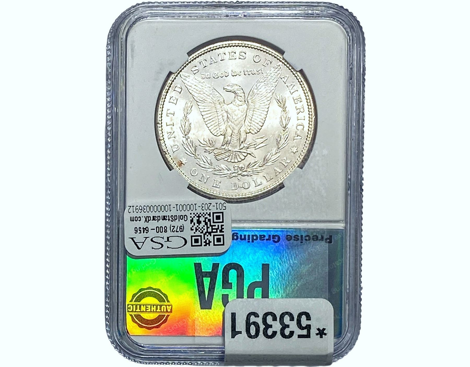 COINS AND CURRENCY LISTED IN GSA’S CATALOG AS GRADED AND ENCAPSULATED BY PCGS, NGC, ANACS, ICG, PCGS CURRENCY, PMG, PCGS BANKNOTE GRADING, CMC OR ANY OTHER THIRD-PARTY GRADING SERVICE ARE LIKEWISE SOLD “AS-IS” EXCEPT AS EXPRESSLY SET FORTH HEREIN. ALL THIRD-PARTY GRADING SERVICE GUARANTEES, INCLUDING AUTHENTICITY, ARE THE SOLE RESPONSIBILITY OF THE THIRD-PARTY GRADING SERVICE AND NOT WARRANTIES OR GUARANTEES OF GSA. BIDDERS SHOULD CONTACT THESE THIRD-PARTY GRADING SERVICES DIRECTLY WITH RESPECT TO ANY CLAIMS OR QUESTIONS THEY MAY HAVE CONCERNING THEIR GUARANTEES AND WARRANTIES. BIDDERS ACKNOWLEDGE AND AGREE THAT AUCTIONEER IS NOT BOUND BY OR LIABLE FOR ANY OPINION OR CERTIFICATION BY ANY THIRD-PARTY GRADING SERVICE. REMOVAL OF A PRODUCT FROM ITS PROTECTIVE CASING OR HOLDER OR ALTERATION OF ANY COIN HOLDER WAIVES ALL RIGHTS CONCERNING THE PRODUCT CONTAINED THEREIN.