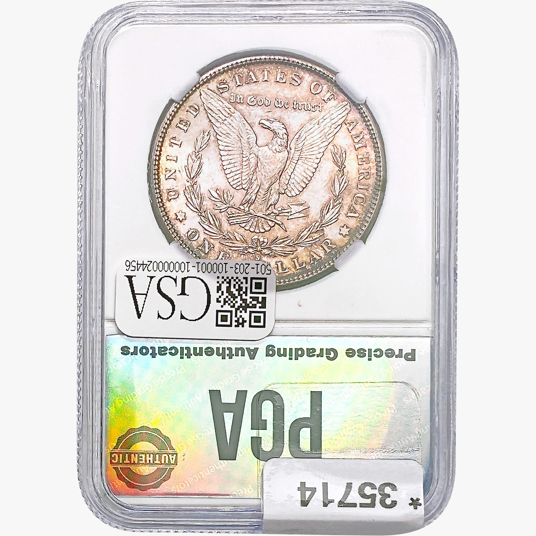 COINS AND CURRENCY LISTED IN GSA’S CATALOG AS GRADED AND ENCAPSULATED BY PCGS, NGC, ANACS, ICG, PCGS CURRENCY, PMG, PCGS BANKNOTE GRADING, CMC OR ANY OTHER THIRD-PARTY GRADING SERVICE ARE LIKEWISE SOLD “AS-IS” EXCEPT AS EXPRESSLY SET FORTH HEREIN. ALL THIRD-PARTY GRADING SERVICE GUARANTEES, INCLUDING AUTHENTICITY, ARE THE SOLE RESPONSIBILITY OF THE THIRD-PARTY GRADING SERVICE AND NOT WARRANTIES OR GUARANTEES OF GSA. BIDDERS SHOULD CONTACT THESE THIRD-PARTY GRADING SERVICES DIRECTLY WITH RESPECT TO ANY CLAIMS OR QUESTIONS THEY MAY HAVE CONCERNING THEIR GUARANTEES AND WARRANTIES. BIDDERS ACKNOWLEDGE AND AGREE THAT AUCTIONEER IS NOT BOUND BY OR LIABLE FOR ANY OPINION OR CERTIFICATION BY ANY THIRD-PARTY GRADING SERVICE. REMOVAL OF A PRODUCT FROM ITS PROTECTIVE CASING OR HOLDER OR ALTERATION OF ANY COIN HOLDER WAIVES ALL RIGHTS CONCERNING THE PRODUCT CONTAINED THEREIN.