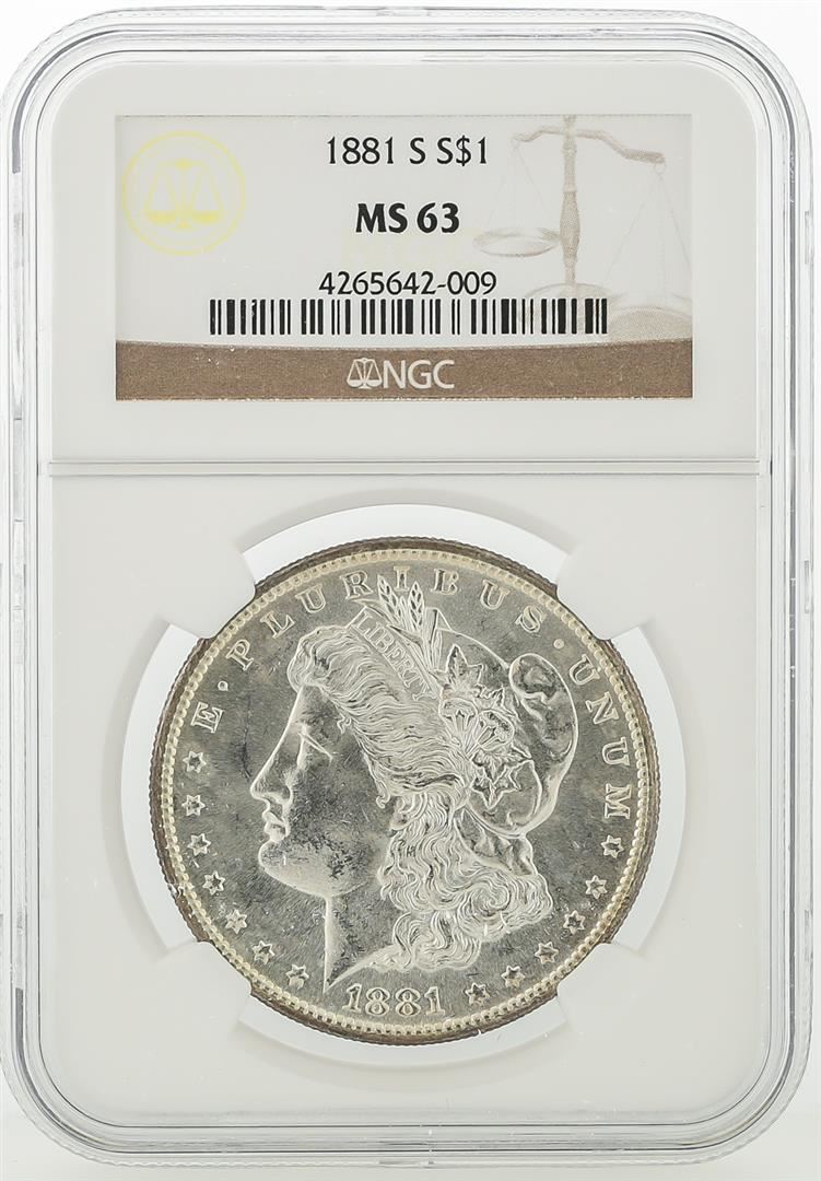 One 1881-S NGC MS63 Morgan Silver Dollar. NGC Certified.