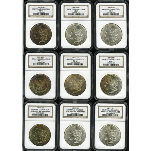 <B>1881-S S$1 MS63 NGC,</B></I> five pieces, most with one-sided gold and magenta toning; <B>1881-S S$1 Brilliant Uncirculated NGC,</B></I> three pieces, significantly abraded but with no trace of wear and similar patina; and a <B>1881-S S$1 MS63 <img border='0' src='http://www.heritagecoins.com/images/star.gif' width=10 height=10> NGC,</B></I> gold, pale emerald, and plum patina with amazing luster.<BR><I>From The Great Falls Collection.</B></I><BR><BR><b>Shipping:</b> Coins & Currency (<a target="_blank" href="http://www.heritageauctions.com/common/shipping.php">view shipping information</a>)