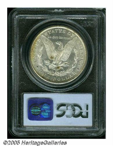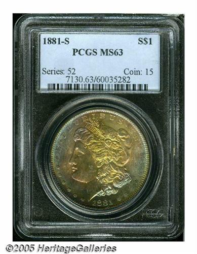 <B>1881-S<S$1> MS63 PCGS.</B></I> The obverse is entirely toned with medium gold color surrounded by iridescent rainbow toning. The reverse is nearly fully brilliant with only a few splashes of pale gold.
