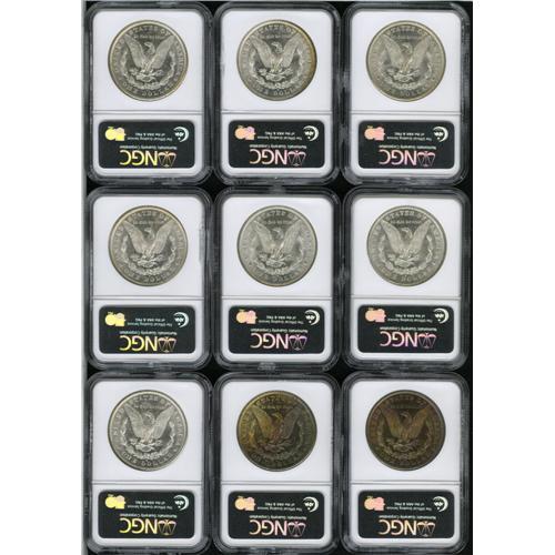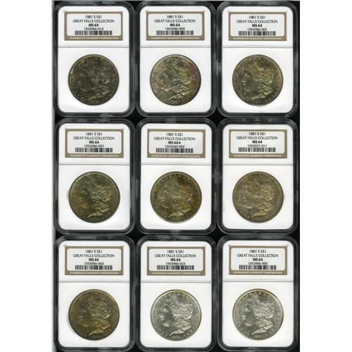 <B>1881-S S$1 MS64 NGC,</B></I> eight pieces, mostly brilliant with one side brilliant and the other toned blue-green and golden tan; and a <B>1881-S S$1 MS64 <img border='0' src='http://www.heritagecoins.com/images/star.gif' width=10 height=10> NGC,</B></I> highly lustrous with pleasing detail, few marks, and captivating reddish-gold and mauve-gray patina over the obverse.<BR><I>From The Great Falls Collection.</B></I><BR><BR><b>Shipping:</b> Coins & Currency (<a target="_blank" href="http://www.heritageauctions.com/common/shipping.php">view shipping information</a>)