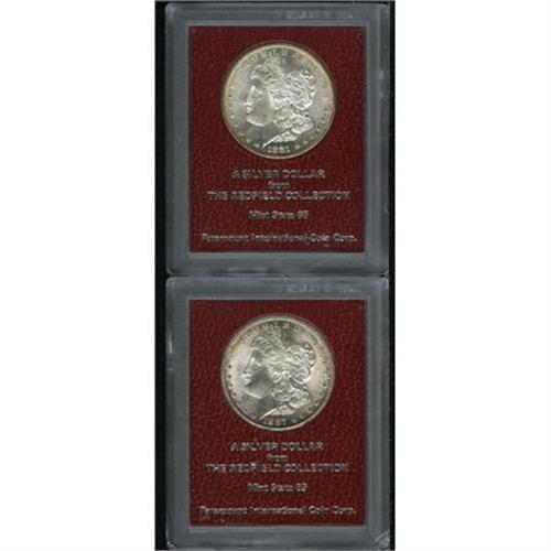 <B>1881-S<img border='0' src='http://www.heritagecoins.com/images/star.gif' width=10 height=10>$1> Morgan Dollar MS65 Paramount International (MS64);</B></I> and an <B>1887-S MS65 Paramount International (MS63).</B></I> Both coins are Ex: Redfield Collection, housed in the red plastic holder as sold by Paramount in the 1970s. Both coins are essentially brilliant with light peripheral gold toning.