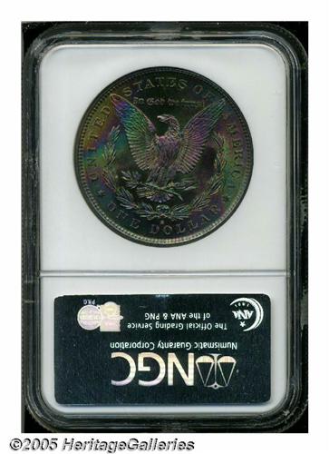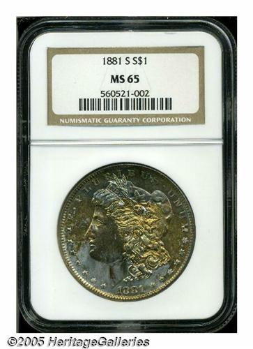 <B>1881-S<S$1> MS65 NGC.</B></I> A horizontal band of bright gold color on the obverse has ivory below and sea-green above. The reverse features an intense rainbow display with considerable lilac and green toning.