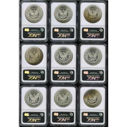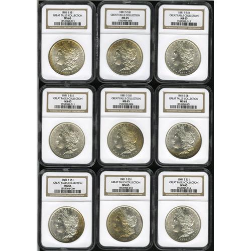 <B>1881-S S$1 MS65 NGC,</B></I> Ex: Great Falls Collection; nine pieces, highly lustrous with toning that ranges from near-brilliance to golden patina over most of one side. Two of the coins have an element of ice-blue as well.<BR><BR><b>Shipping:</b> Coins & Currency (<a target="_blank" href="http://www.heritageauctions.com/common/shipping.php">view shipping information</a>)