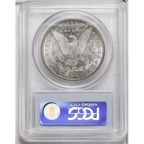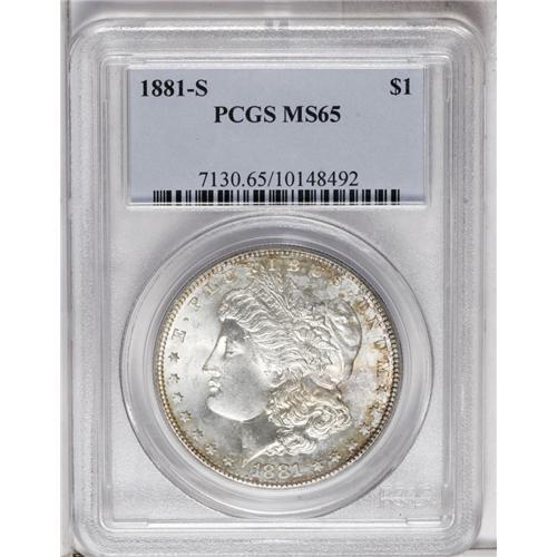 <B>1881-S<img border='0' src='http://www.heritagecoins.com/images/star.gif' width=10 height=10>$1> MS65 PCGS.</B></I> Appealing for the grade with golden-amber color seeping onto the obverse surfaces. A cornucopia of lime-green, bronze, violet, and blue patina graces the entirety of the reverse. Certainly not uncommon for the type, but unusual for the eye appeal.