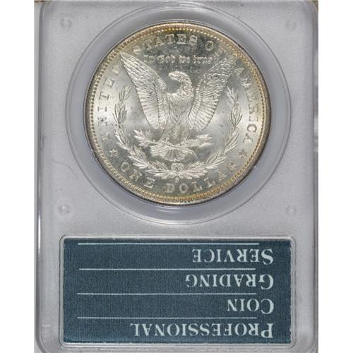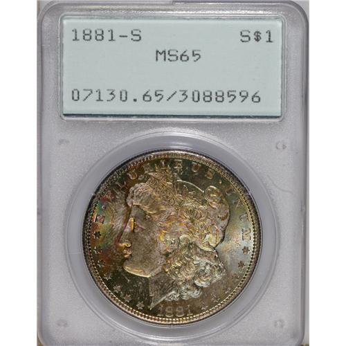 <B>1881-S S$1 MS65 PCGS.</B></I> It is amazing that so many '81-S Morgan dollars were well struck, considering the high mintage; this piece is just one more example of that phenomenon. Residing in a first-generation PCGS holder, this Gem exhibits lovely, variegated rose and green iridescence on the obverse. The reverse is flashy, bright, and brilliant, save for a touch of golden-orange on the upper left border. Both sides show two or three minor marks.<BR><BR><b>Shipping:</b> Coins & Currency (<a target="_blank" href="http://www.heritageauctions.com/common/shipping.php">view shipping information</a>)