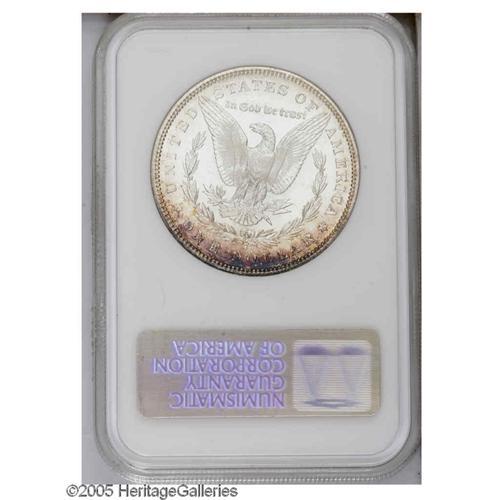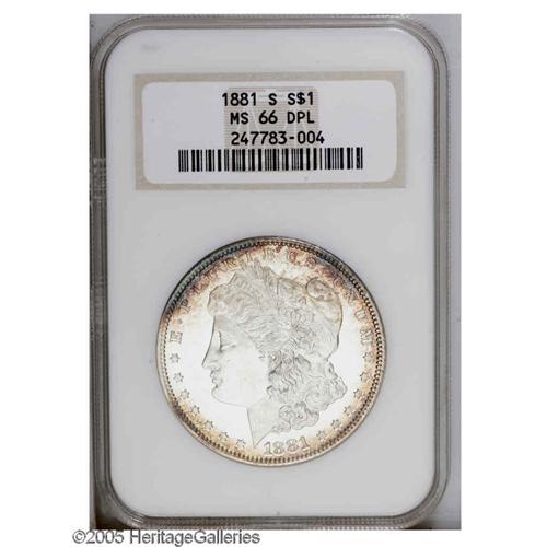 <B>1881-S<S$1> MS66 Deep Mirror Prooflike NGC.</B></I> Russet and cobalt-blue toning clings to the rims, framing the brilliant centers. Sharply struck, with no mentionable marks.