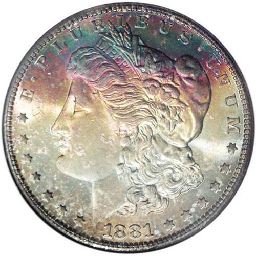 1881-S S$1 MS66 NGC. Glorious magenta, jade-green, and
