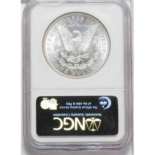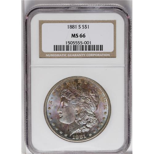 <B>1881-S<img border='0' src='http://www.heritagecoins.com/images/star.gif' width=10 height=10>$1> MS66 NGC.</B></I> White on the reverse with an unusual, but highly attractive blend of blue, purple, and sherbet patina over the entirety of the obverse. Inspection reveals devices that are sharp and surfaces that are free from distracting marks. A seemingly high-end coin for the grade.