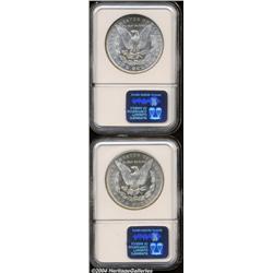 <B>1881-S<S$1> MS66 NGC,</B></I> well struck and brilliant, with booming cartwheel luster on both sides, and very few small surface marks; and an <B>1886 MS66 NGC,</B></I> sharply struck with clean, lustrous, well preserved surfaces and an arc of rich electric-blue, apricot, and crimson iridescence across the lower half of the obverse. 2 Coins <BR><BR><B>Important notice:</B> Heritage usually auctions material at the rate of 200-250 lots per hour. On some occasions eBay Live bid software or the Internet may not be able to keep up with the pace of the auction. We recommend placing a realistic absentee bid now as insurance to avoid disappointment. Occasionally the auctioneer may eliminate or reject an eBay Live bid, and the auctioneer may also reopen a lot after the close of the eBay live bidding (usually because we missed an audience bid), and may reject your bid even if it shows you as the winning bidder. By bidding via eBay Live, you agree that Heritage may award the lot to another bidder at its sole discretion under the circumstances described above or any other reasonable circumstances. Since eBay bids are not shown to us until we open the lot on the floor, we treat those bids just like floor bids. In most cases the floor responds before the eBay bid is presented to us, due to Internet lag time, so for consistency we have made it a policy that floor bids are always considered first over tie eBay live bids. Also please note that all Heritage lots purchased through eBay Live carry a 20% Buyer's Premium. Please make sure you read the Terms and Conditions before you bid. </span></font></tr></table></td></tr></table>