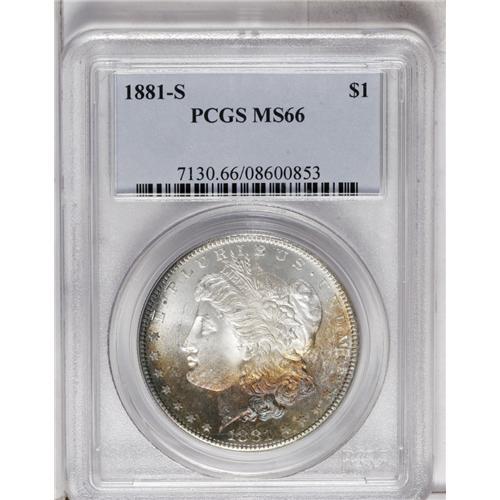 <B>1881-S<img border='0' src='http://www.heritagecoins.com/images/star.gif' width=10 height=10>$1> MS66 PCGS.</B></I> Completely white on the reverse. A vivid half-moon-shaped area of amber, magenta, royal-blue, and lime-green graces the lower portion of the obverse. A spectacularly attractive example for the grade.