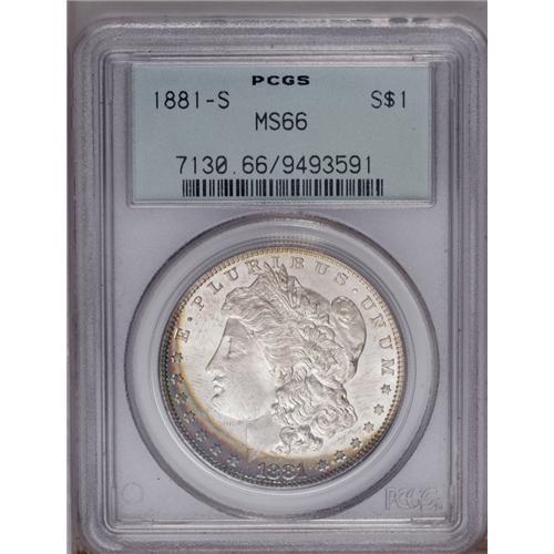 <B>1881-S<img border='0' src='http://www.heritagecoins.com/images/star.gif' width=10 height=10>$1> MS66 PCGS.</B></I> This well struck available date dollar has a lovely arc of multi-color toning on the lower left obverse, and a blush of golden-brown toning on the upper right reverse. A possible fingerprint fragment is noted near the chin. Housed in a green label holder. <BR><BR><B>Important notice:</B> Heritage usually auctions material at the rate of 200-250 lots per hour. On some occasions eBay Live bid software or the Internet may not be able to keep up with the pace of the auction. We recommend placing a realistic absentee bid now as insurance to avoid disappointment. Occasionally the auctioneer may eliminate or reject an eBay Live bid, and the auctioneer may also reopen a lot after the close of the eBay live bidding (usually because we missed an audience bid), and may reject your bid even if it shows you as the winning bidder. By bidding via eBay Live, you agree that Heritage may award the lot to another bidder at its sole discretion under the circumstances described above or any other reasonable circumstances. Since eBay bids are not shown to us until we open the lot on the floor, we treat those bids just like floor bids. In most cases the floor responds before the eBay bid is presented to us, due to Internet lag time, so for consistency we have made it a policy that floor bids are always considered first over tie eBay live bids. Also please note that all Heritage lots purchased through eBay Live carry a 20% Buyer's Premium. Please make sure you read the Terms and Conditions before you bid. This lot is being auctioned in conjunction with a live floor auction by Heritage Galleries & Auctioneers. All final auction and invoice information will be supplied by Heritage Galleries & Auctioneers, and all other information should be considered preliminary. Lot:3322 <BR><BR><B>Winning Notification and Billing:</B> After the FINAL session in this auction is complete, Heritage will send e-mail and snail mail invoices. This process normally takes several days. All final auction and invoice information will be supplied by Heritage Galleries & Auctioneers, and all other information should be considered preliminary. <BR><BR>This auction will be conducted on a live auction floor and over the Internet through eBay Live. If you choose to place an absentee bid, please take a moment to <font color='#0000ff'><u><a href='http://pages.ebay.com/liveauctions/help/before/laabsentee.html'>learn how eBay Live absentee bidding works</a></u></font><font color='#000000'>