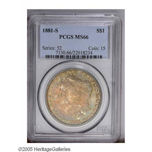 1881-S S$1 MS66 PCGS. Vividly toned in plum, forest-gr 1881-S[S$1] MS66 PCGS.