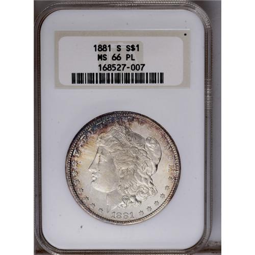 <B>1881-S<img border='0' src='http://www.heritagecoins.com/images/star.gif' width=10 height=10>$1> MS66 Prooflike NGC.</B></I> This flashy and exactingly struck silver dollar exhibits brilliant centers bounded by freckles of fire-red, gold, and blue-green patina. Housed in a prior generation holder. <BR><BR><B>Important notice:</B> Heritage usually auctions material at the rate of 200-250 lots per hour. On some occasions eBay Live bid software or the Internet may not be able to keep up with the pace of the auction. We recommend placing a realistic absentee bid now as insurance to avoid disappointment. Occasionally the auctioneer may eliminate or reject an eBay Live bid, and the auctioneer may also reopen a lot after the close of the eBay live bidding (usually because we missed an audience bid), and may reject your bid even if it shows you as the winning bidder. By bidding via eBay Live, you agree that Heritage may award the lot to another bidder at its sole discretion under the circumstances described above or any other reasonable circumstances. Since eBay bids are not shown to us until we open the lot on the floor, we treat those bids just like floor bids. In most cases the floor responds before the eBay bid is presented to us, due to Internet lag time, so for consistency we have made it a policy that floor bids are always considered first over tie eBay live bids. Also please note that all Heritage lots purchased through eBay Live carry a 20% Buyer's Premium. Please make sure you read the Terms and Conditions before you bid. This lot is being auctioned in conjunction with a live floor auction by Heritage Galleries & Auctioneers. All final auction and invoice information will be supplied by Heritage Galleries & Auctioneers, and all other information should be considered preliminary. Lot:3335 <BR><BR><B>Winning Notification and Billing:</B> After the FINAL session in this auction is complete, Heritage will send e-mail and snail mail invoices. This process normally takes several days. All final auction and invoice information will be supplied by Heritage Galleries & Auctioneers, and all other information should be considered preliminary. <BR><BR>This auction will be conducted on a live auction floor and over the Internet through eBay Live. If you choose to place an absentee bid, please take a moment to <font color='#0000ff'><u><a href='http://pages.ebay.com/liveauctions/help/before/laabsentee.html'>learn how eBay Live absentee bidding works</a></u></font><font color='#000000'>