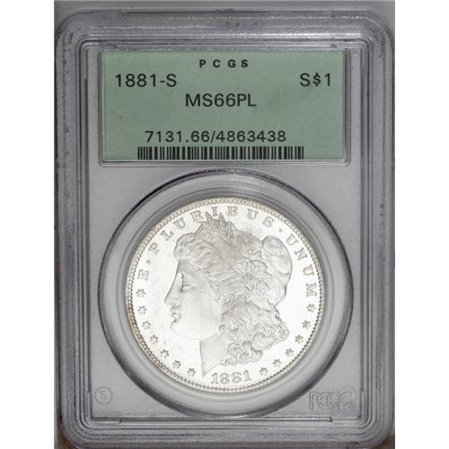 <B>1881-S<img border='0' src='http://www.heritagecoins.com/images/star.gif' width=10 height=10>$1 MS66 Prooflike PCGS.</B></I> The decidedly mirrored fields approach a DMPL designation, and both sides are nearly brilliant save for a blush of tan color near 9 o'clock on the reverse. Precisely struck, as usual for this familiar issue, and exceptionally undisturbed by contact. In a green label holder.