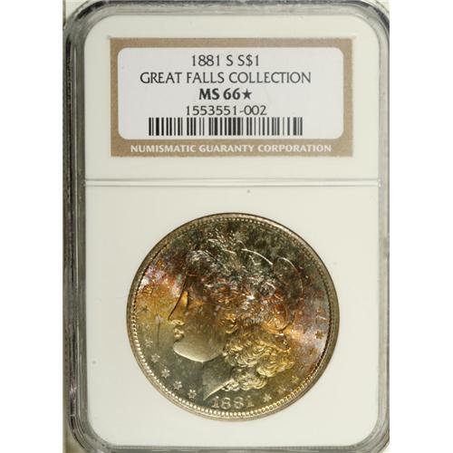 <B>1881-S S$1 MS66 <img border='0' src='http://www.heritagecoins.com/images/star.gif' width=10 height=10> NGC.</B></I> The crisply struck reverse has exemplary brilliance, while the colorful reverse has enticing violet-blue, magenta, and gold patina. Minimally marked with only a handful of small luster grazes.<BR><I>From The Great Falls Collection.</B></I><BR><BR><b>Shipping:</b> Coins & Currency (<a target="_blank" href="http://www.heritageauctions.com/common/shipping.php">view shipping information</a>)