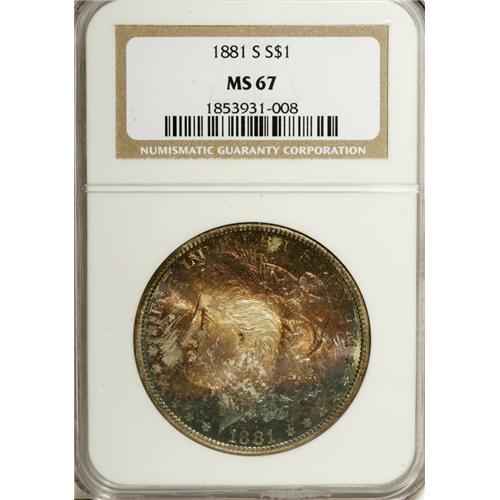 <B>1881-S S$1 MS67 NGC.</B></I> A highly lustrous and boldly struck example of this popular type issue. While blue-green, ruby, and sunset-orange patina covers most of the obverse, only a hint of rim toning is apparent on the reverse.<BR><BR><b>Shipping:</b> Coins & Currency (<a target="_blank" href="http://www.heritageauctions.com/common/shipping.php">view shipping information</a>)