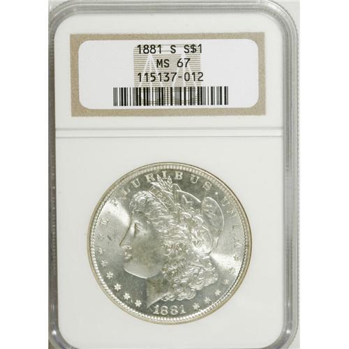 1881-S S$1 MS67 NGC. Crisply struck and virtually unto