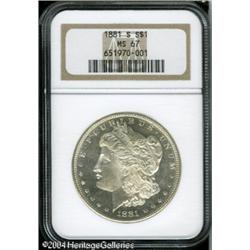 1881-S S$1 MS67 NGC. Exceptional semi-prooflike lu <B>1881-S S$1 MS67 NGC.</B></I> Exceptional semi-prooflike luster and beautifully undisturbed surfaces confirm the lofty grade of this well struck and virtually brilliant Superb Gem. <BR><BR><B>Important notice:</B> Heritage usually auctions material at the rate of 200-250 lots per hour. On some occasions eBay Live bid software or the Internet may not be able to keep up with the pace of the auction. We recommend placing a realistic absentee bid now as insurance to avoid disappointment. Occasionally the auctioneer may eliminate or reject an eBay Live bid, and the auctioneer may also reopen a lot after the close of the eBay live bidding (usually because we missed an audience bid), and may reject your bid even if it shows you as the winning bidder. By bidding via eBay Live, you agree that Heritage may award the lot to another bidder at its sole discretion under the circumstances described above or any other reasonable circumstances. Since eBay bids are not shown to us until we open the lot on the floor, we treat those bids just like floor bids. In most cases the floor responds before the eBay bid is presented to us, due to Internet lag time, so for consistency we have made it a policy that floor bids are always considered first over tie eBay live bids. Also please note that all Heritage lots purchased through eBay Live carry a 20% Buyer's Premium. Please make sure you read the Terms and Conditions before you bid. This lot is being auctioned in conjunction with a live floor auction by Heritage Galleries & Auctioneers. All final auction and invoice information will be supplied by Heritage Galleries & Auctioneers, and all other information should be considered preliminary. Lot:7400