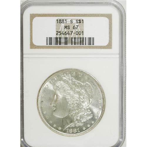 1881-S S$1 MS67 NGC. Mostly brilliant with flashy, sem