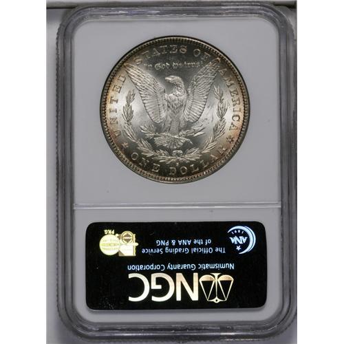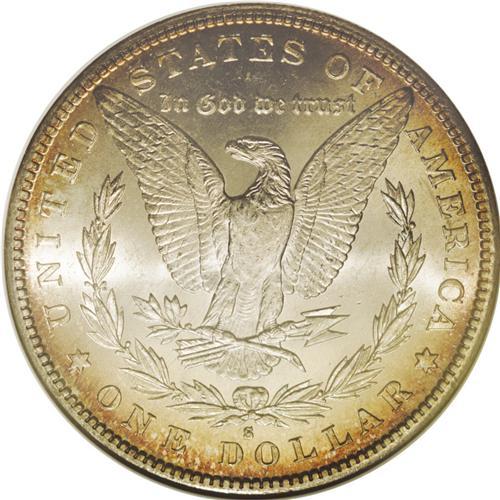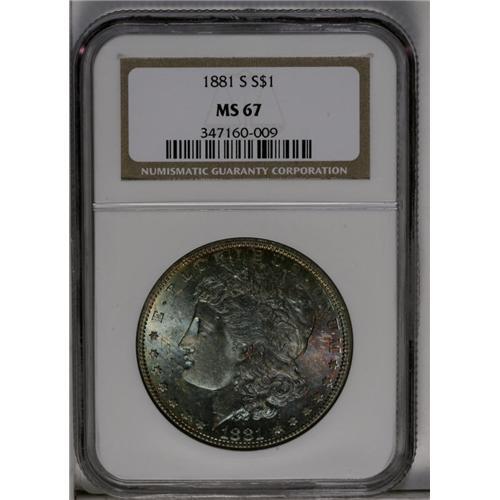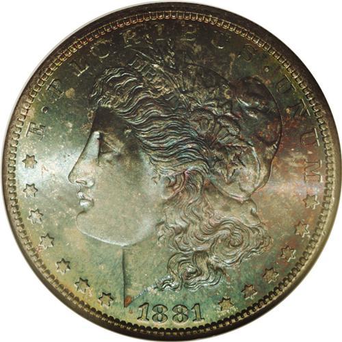 <B>1881-S<img border='0' src='http://www.heritagecoins.com/images/star.gif' width=10 height=10>$1> MS67 NGC.</B></I> The obverse is richly toned in shades of deep aqua-blue that are accented with red and gold. The reverse is mostly brilliant with a peripheral ring of sunset-red. A lovely, sharply struck Superb Gem with exquisite eye appeal.