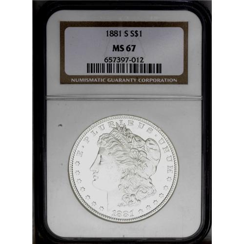 <B>1881-S<img border='0' src='http://www.heritagecoins.com/images/star.gif' width=10 height=10>$1> MS67 NGC.</B></I> This is a fully brilliant Superb Gem with bright white surfaces and satiny luster. It is sharply struck with nicely defined design elements throughout. A lovely coin for the type collector. <BR><BR><B>Important notice:</B> Heritage usually auctions material at the rate of 200-250 lots per hour. On some occasions eBay Live bid software or the Internet may not be able to keep up with the pace of the auction. We recommend placing a realistic absentee bid now as insurance to avoid disappointment. Occasionally the auctioneer may eliminate or reject an eBay Live bid, and the auctioneer may also reopen a lot after the close of the eBay live bidding (usually because we missed an audience bid), and may reject your bid even if it shows you as the winning bidder. By bidding via eBay Live, you agree that Heritage may award the lot to another bidder at its sole discretion under the circumstances described above or any other reasonable circumstances. Since eBay bids are not shown to us until we open the lot on the floor, we treat those bids just like floor bids. In most cases the floor responds before the eBay bid is presented to us, due to Internet lag time, so for consistency we have made it a policy that floor bids are always considered first over tie eBay live bids. Also please note that all Heritage lots purchased through eBay Live carry a 20% Buyer's Premium. Please make sure you read the Terms and Conditions before you bid. This lot is being auctioned in conjunction with a live floor auction by Heritage Galleries & Auctioneers. All final auction and invoice information will be supplied by Heritage Galleries & Auctioneers, and all other information should be considered preliminary. Lot:3329 <BR><BR><B>Winning Notification and Billing:</B> After the FINAL session in this auction is complete, Heritage will send e-mail and snail mail invoices. This process normally takes several days. All final auction and invoice information will be supplied by Heritage Galleries & Auctioneers, and all other information should be considered preliminary. <BR><BR>This auction will be conducted on a live auction floor and over the Internet through eBay Live. If you choose to place an absentee bid, please take a moment to <font color='#0000ff'><u><a href='http://pages.ebay.com/liveauctions/help/before/laabsentee.html'>learn how eBay Live absentee bidding works</a></u></font><font color='#000000'>