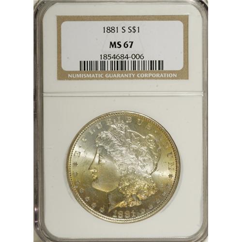 1881-S S$1 MS67 NGC. Yellow-gold and pink-rose toning