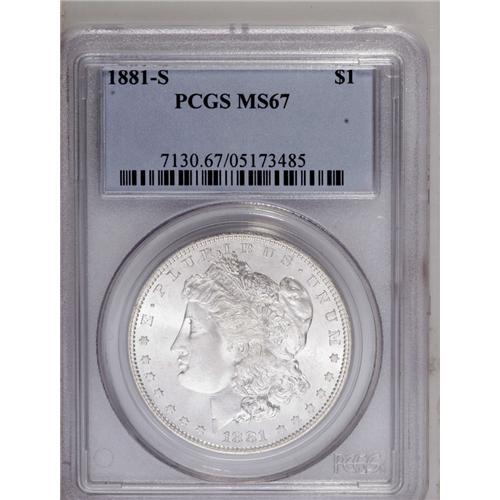 <B>1881-S<img border='0' src='http://www.heritagecoins.com/images/star.gif' width=10 height=10>$1> MS67 PCGS.</B></I> A brilliant example of this popular type issue. On this sharply struck piece, the cheek is clean and the fields are nearly so. Bold and attractive.