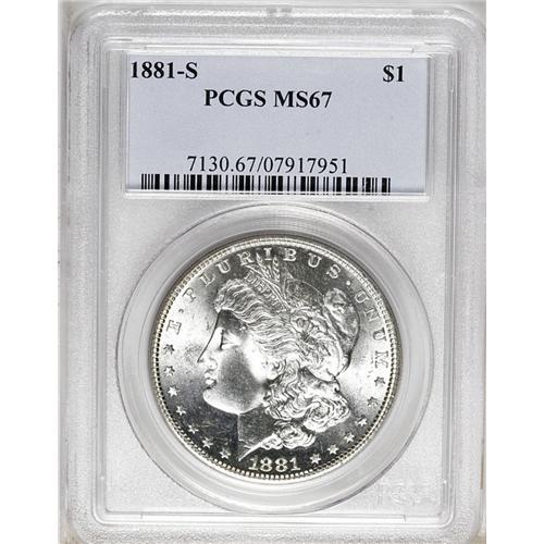 <B>1881-S<img border='0' src='http://www.heritagecoins.com/images/star.gif' width=10 height=10>$1> MS67 PCGS.</B></I> A gleaming and brilliant Superb Gem. With intense cartwheel luster and seemingly immaculate surfaces. The S-mint Morgan dollar issues of 1880-1882 are renowned for their quality and availability in high Mint State grades.