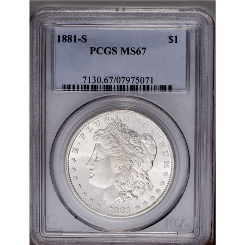 <B>1881-S<img border='0' src='http://www.heritagecoins.com/images/star.gif' width=10 height=10>$1> MS67 PCGS.</B></I> An outstanding type coin that provides potent luster, a needle-sharp strike, and unblemished fields and devices. Only a trace of tan toning precludes full brilliance. <BR><BR><B>Important notice:</B> Heritage usually auctions material at the rate of 200-250 lots per hour. On some occasions eBay Live bid software or the Internet may not be able to keep up with the pace of the auction. We recommend placing a realistic absentee bid now as insurance to avoid disappointment. Occasionally the auctioneer may eliminate or reject an eBay Live bid, and the auctioneer may also reopen a lot after the close of the eBay live bidding (usually because we missed an audience bid), and may reject your bid even if it shows you as the winning bidder. By bidding via eBay Live, you agree that Heritage may award the lot to another bidder at its sole discretion under the circumstances described above or any other reasonable circumstances. Since eBay bids are not shown to us until we open the lot on the floor, we treat those bids just like floor bids. In most cases the floor responds before the eBay bid is presented to us, due to Internet lag time, so for consistency we have made it a policy that floor bids are always considered first over tie eBay live bids. Also please note that all Heritage lots purchased through eBay Live carry a 20% Buyer's Premium. Please make sure you read the Terms and Conditions before you bid. This lot is being auctioned in conjunction with a live floor auction by Heritage Galleries & Auctioneers. All final auction and invoice information will be supplied by Heritage Galleries & Auctioneers, and all other information should be considered preliminary. Lot:3325 <BR><BR><B>Winning Notification and Billing:</B> After the FINAL session in this auction is complete, Heritage will send e-mail and snail mail invoices. This process normally takes several days. All final auction and invoice information will be supplied by Heritage Galleries & Auctioneers, and all other information should be considered preliminary. <BR><BR>This auction will be conducted on a live auction floor and over the Internet through eBay Live. If you choose to place an absentee bid, please take a moment to <font color='#0000ff'><u><a href='http://pages.ebay.com/liveauctions/help/before/laabsentee.html'>learn how eBay Live absentee bidding works</a></u></font><font color='#000000'>