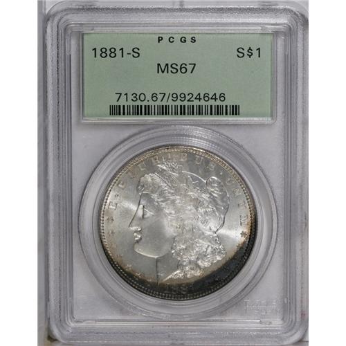 1881-S S$1 MS67 PCGS. Arcs of dusky olive-green, gold,