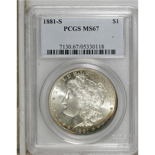1881-S S$1 MS67 PCGS. Brief but luminous bands of lemo