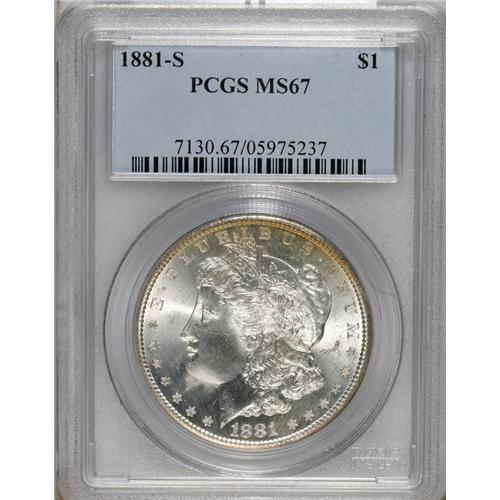 1881-S S$1 MS67 PCGS. Iridescent ice-blue and honey to
