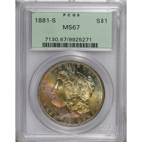 <B>1881-S S$1 MS67 PCGS.</B></I> The reverse of this highly lustrous and boldly impressed example has light cream-gold toning overall. The obverse has a wider palette, with thin emerald-aqua patina at the upper right, magenta-pink toning in an arc from 9 o'clock to 6 o'clock, and bright yellow-gold on either side. Immensely appealing. Housed in a green label holder.<BR><BR><b>Shipping:</b> Coins & Currency (<a target="_blank" href="http://www.heritageauctions.com/common/shipping.php">view shipping information</a>)