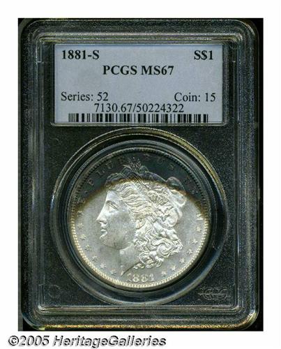 <B>1881-S<S$1> MS67 PCGS.</B></I> What an interesting piece. The top of the obverse has a long arc of toning. At first glance it appears black, but when angled just so a rainbow of colors appear. Fully struck and exceptionally clean also, but this is unfortunately an afterthought as the viewer's attention is immediately drawn to the toning.