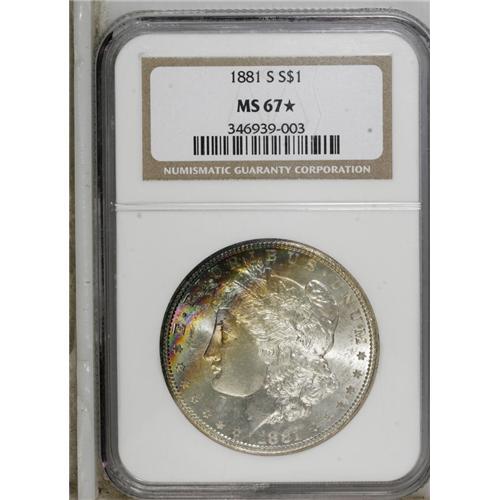 1881-S S$1 MS67 S NGC. Colorful bands of toning domin