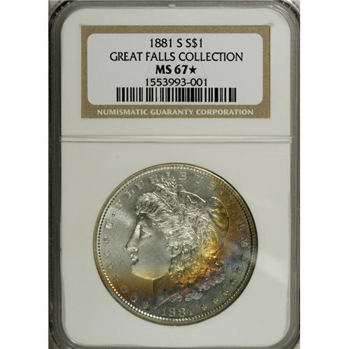 <B>1881-S S$1 MS67 <img border='0' src='http://www.heritagecoins.com/images/star.gif' width=10 height=10> NGC.</B></I> Each side of this gleaming Superb Gem exhibits a degree of reflectivity. The lower right obverse sports a crescent of gold, violet, and ice-blue patina, while the reverse is untoned.<BR><I>From The Great Falls Collection.</B></I><BR><BR><b>Shipping:</b> Coins & Currency (<a target="_blank" href="http://www.heritageauctions.com/common/shipping.php">view shipping information</a>)