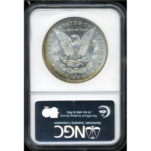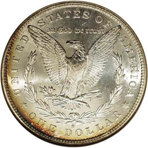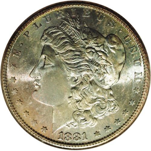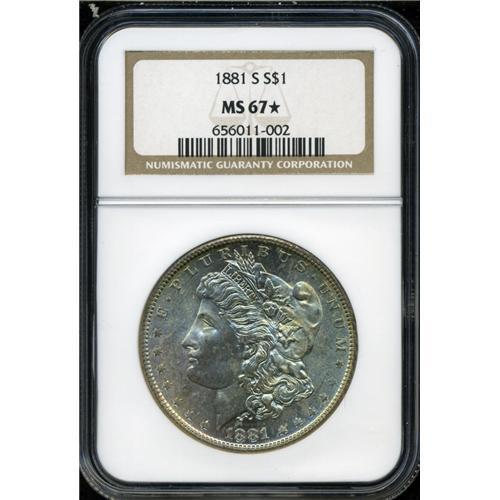 <B>1881-S<img border='0' src='http://www.heritagecoins.com/images/star.gif' width=10 height=10>$1> MS67 <img border='0' src='http://www.heritagecoins.com/images/star.gif' width=10 height=10> NGC.</B></I> Fully struck with bright, coruscating luster, and well preserved, minimally marked surfaces. A deep coating of sea-green and rose coloration blankets the obverse, while the reverse is very flashy, brilliant in the centers, and shows attractive golden-russet and green toning along the lower left periphery. A lovely Superb Gem, deserving of its star designation, awarded by NGC for superior eye appeal.