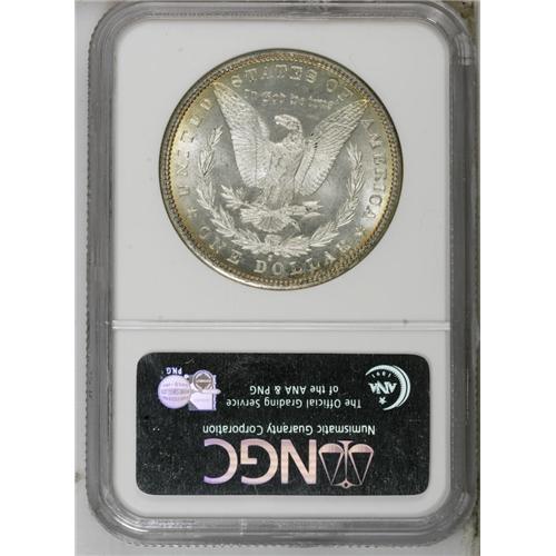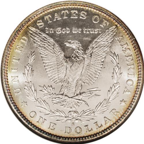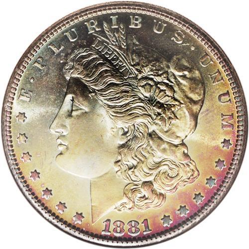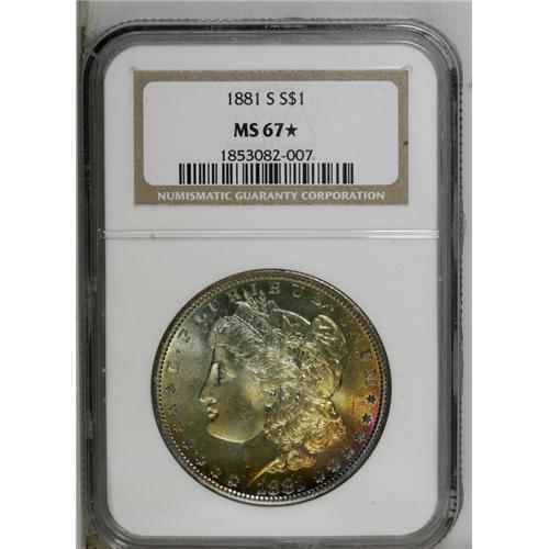 <B>1881-S S$1 MS67 <img border='0' src='http://www.heritagecoins.com/images/star.gif' width=10 height=10> NGC.</B></I> This coin received the coveted <img border='0' src='http://www.heritagecoins.com/images/star.gif' width=10 height=10> designation from NGC for its exceptional eye appeal. The fields on both sides are reflective and virtually free of any blemishes. A few hidden marks are noted among the devices. The obverse has vivid turquoise, gold, orange, and lilac toning across the entire surface, while the reverse is framed by peripheral gold.<BR><BR><b>Shipping:</b> Coin/Currency (<a target="_blank" href="http://www.heritageauctions.com/common/shipping.php">view shipping information</a>)