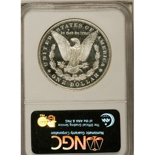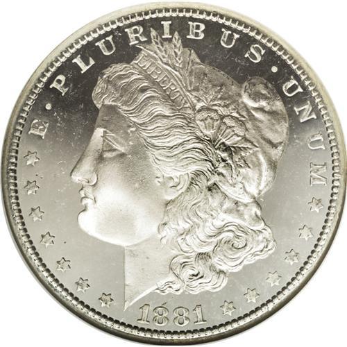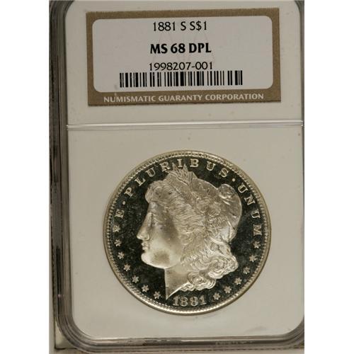 <B>1881-S S$1 MS68 Deep Mirror Prooflike NGC.</B></I> Spectacularly mirrored fields and radiant ice-white devices exhibit exceptional cameo contrast. This meticulously struck Superb Gem is fully brilliant, and has remarkably smooth fields. A small mint-made flaw above GOD will identify this example should it appear again at auction. The 1881-S is a common date in typical Mint State grades, but Deep Mirror Prooflike dollars with such exceptional preservation are few and far between. Worthy of the finest quality silver type set. Census: 2 in 68 Deep Mirror Prooflike, 0 finer (10/06).<BR><BR><b>Shipping:</b> Coin/Currency (<a target="_blank" href="http://www.heritageauctions.com/common/shipping.php">view shipping information</a>)