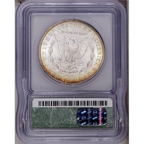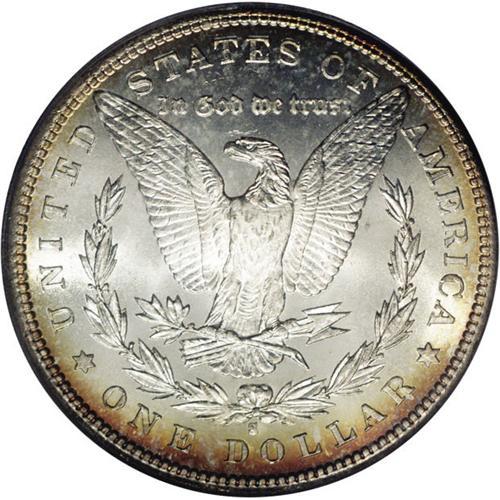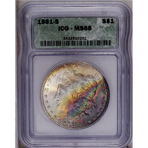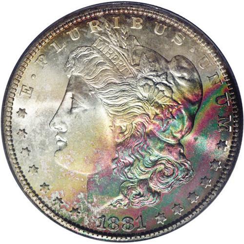 <B>1881-S<img border='0' src='http://www.heritagecoins.com/images/star.gif' width=10 height=10>$1> MS68 ICG.</B></I> Nearly flawless with the lower right half of the obverse covered in magnificent forest-green, crimson, purple, and gold-orange iridescent toning, while the reverse displays light golden-brown patination around the peripheries.. The design features are exquisitely struck, including nice definition in the hair over Liberty's ear and on the eagle's breast feathers. Just a spectacular, flashy coin.