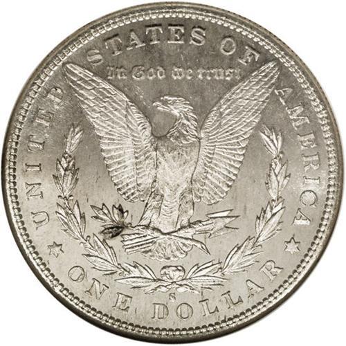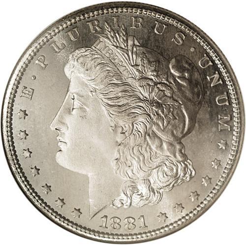 <B>1881-S<img border='0' src='http://www.heritagecoins.com/images/star.gif' width=10 height=10>$1> MS68 NGC.</B></I> Resting on the threshold of technical perfection for a Morgan dollar, this extraordinary coin is also endowed with radiant luster and pinpoint sharpness, both qualities that are normal for the issue. A hint of opaque-tan patina gently enhances each side. As an identifier, some black toning is seen on the highpoints of the olive leaves on the branch held in the eagle's left (facing) claw. Census: 95 in 68, 0 finer (4/06).