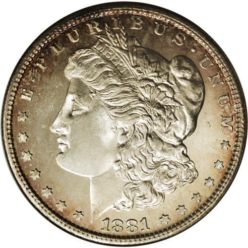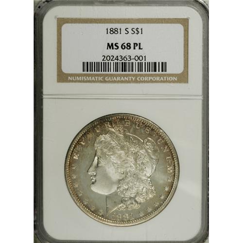 <B>1881-S S$1 MS68 Prooflike NGC.</B></I> This piece is mostly brilliant with excellent cameo contrast on both sides. Splendid rose, gold, and blue toning is confined to the peripheral areas, primarily on the obverse. This example is tied for the finest prooflike piece certified by NGC or PCGS. Census: 7 in 68 PL, 0 finer (1/07).<BR><BR><b>Shipping:</b> Coins & Currency (<a target="_blank" href="http://www.heritageauctions.com/common/shipping.php">view shipping information</a>)