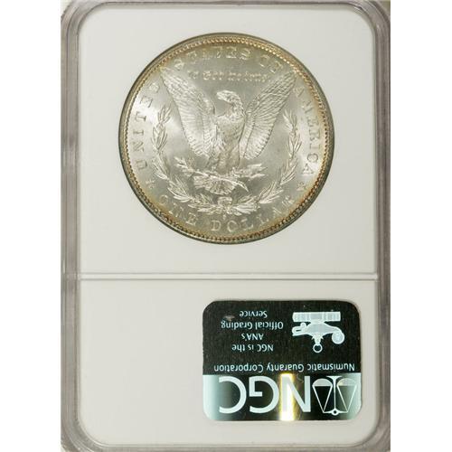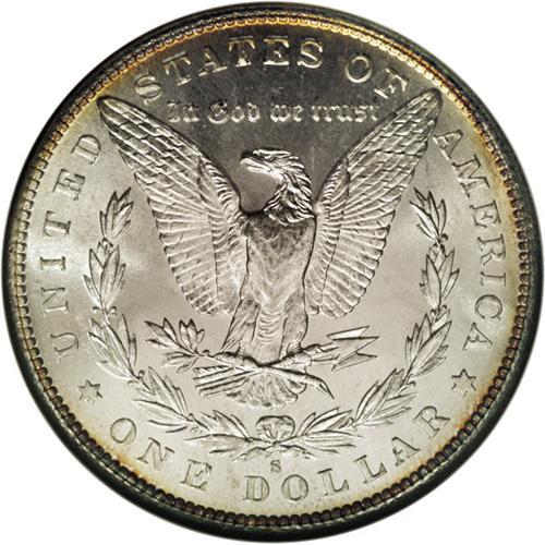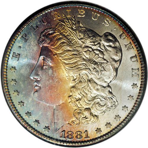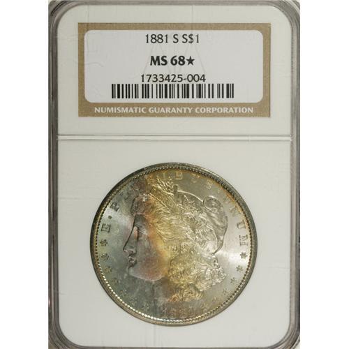 <B>1881-S S$1 MS68 <img border='0' src='http://www.heritagecoins.com/images/star.gif' width=10 height=10> NGC.</B></I> The spectacular bands of rainbow obverse toning garner the Star rating for this piece, with waves of ice-blue, cerise, violet, and canary-yellow cascading across, ending in a swath of silver brilliance. The surfaces are as clean as they are colorful, as perusal with a loupe reveals a total lack of visible impairments. The reverse is brilliant with a ring of honey-gold, and both sides are sharply struck. A wonder coin for the color enthusiasts. Census: 11 in 68 S, 0 finer (4/07).<BR><BR><b>Shipping:</b> Coins & Currency (<a target="_blank" href="http://www.heritageauctions.com/common/shipping.php">view shipping information</a>)