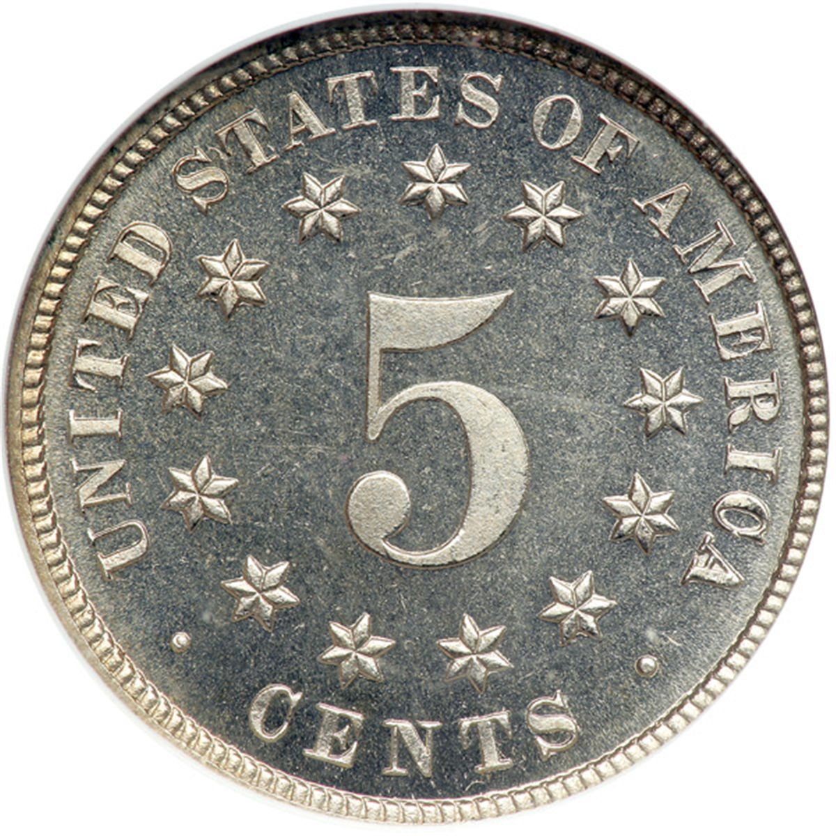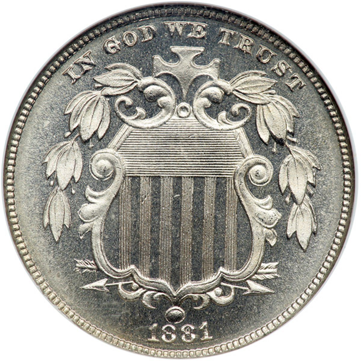 1881 Shield Nickel. NGC graded Proof 66 Cameo. A superb untoned gem example. Only 3,575 Proofs struck. The lowest mintage dates in the Shield Nickel series group themselves in the years 1877-81. Pop 54; 27 in 67 CAM, 1 in 68 CAM.