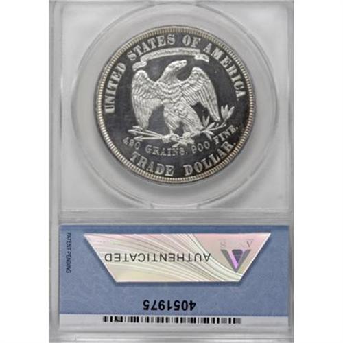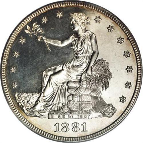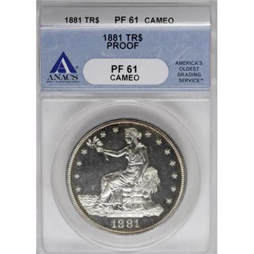 <B>1881 T$1 PR61 Cameo ANACS.</B></I> An amazing piece with a high degree of eye appeal, despite the low numerical grade. Both sides are brilliant and essentially untoned, with a faint trace of gold clinging to the upper obverse and around part of the reverse. The contrast is light but evident on both sides.<BR><I>From The John Stimson, Sr. Collection, Part Two.</B></I><BR><BR><b>Shipping:</b> Coins & Currency (<a target="_blank" href="http://www.heritageauctions.com/common/shipping.php">view shipping information</a>)