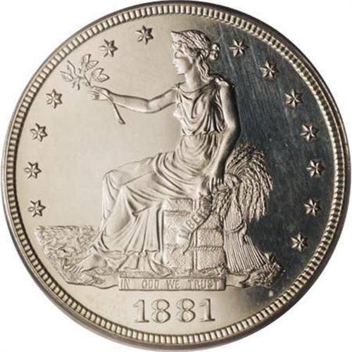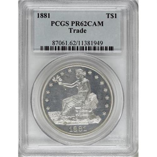 <B>1881 T$1 PR62 Cameo PCGS.</B></I> The 1881 proof-only Trade dollar usually come poorly struck, especially on Liberty's head and the upper stars (David Bowers, 1993). The PR62 Cameo in the current lot is an exception to the profile, as it was the recipient of a well executed strike. Liberty's hair and the stars are sharply defined, as are the remaining design elements. The surfaces are untoned, and exhibit strong field-motif contrast. Fine hairlines in the fields limit the grade.<BR><BR><b>Shipping:</b> Coins & Currency (<a target="_blank" href="http://www.heritageauctions.com/common/shipping.php">view shipping information</a>)